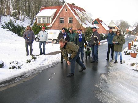 Am Anfang eines jeden neuen Jahres treffen sich überall in der Grafschaft kleine Kloatscheeter-Gruppen zum geselligen Wettstreit. Vor Spielbeginn werden von den Mannschaften Wegstrecke mit Ausgangspunkt und Ziel festgelegt. Auch die Reihenfolge der Spieler wird für den ganzen Spielverlauf vorher ausgemacht. Der erste Werfer einer Mannschaft versucht, den Kloat mit einem Wurf auf der Strecke weit voranzubringen. Werfer Nr. 1 der gegnerischen Mannschaft bemüht sich nun mit seinem Wurf, den Gegenspieler möglichst zu übertreffen. Erreicht sein Kloat den anderen nicht, schließt der zweite Spieler der zurückliegenden Mannschaft mit seinem Wurf an. Scheeter Nr. 2 der ersten Mannschaft setzt das Spiel fort, wenn sein Kloat zurückliegt. Und so weiter, und so weiter ... Gewonnen hat diejenige Mannschaft, die insgesamt am weitesten geworfen hat. Nach Beendigung des Spiels wird der "Kloatkönig" ausgewählt. Hierfür zielen beide Mannschaften abwechselnd auf eine leere Schnapsflasche. König/-in ist der-/diejenige, der/die zuerst die Flasche so trifft, dass sie zerbricht. Übrigens: Immer wieder gibt es bei den Würfen "Blindgänger" - Kloats, die in Gräben fallen oder in Büschen landen und nur selten wieder aufzufinden sind. Bei der Suche wird es auf keinen Fall langweilig! Und nach getaner Arbeit wird mit "Mettwosst en Moos", einem deftigen Grünkohlessen, zünftig in geselliger Runde gefeiert.
