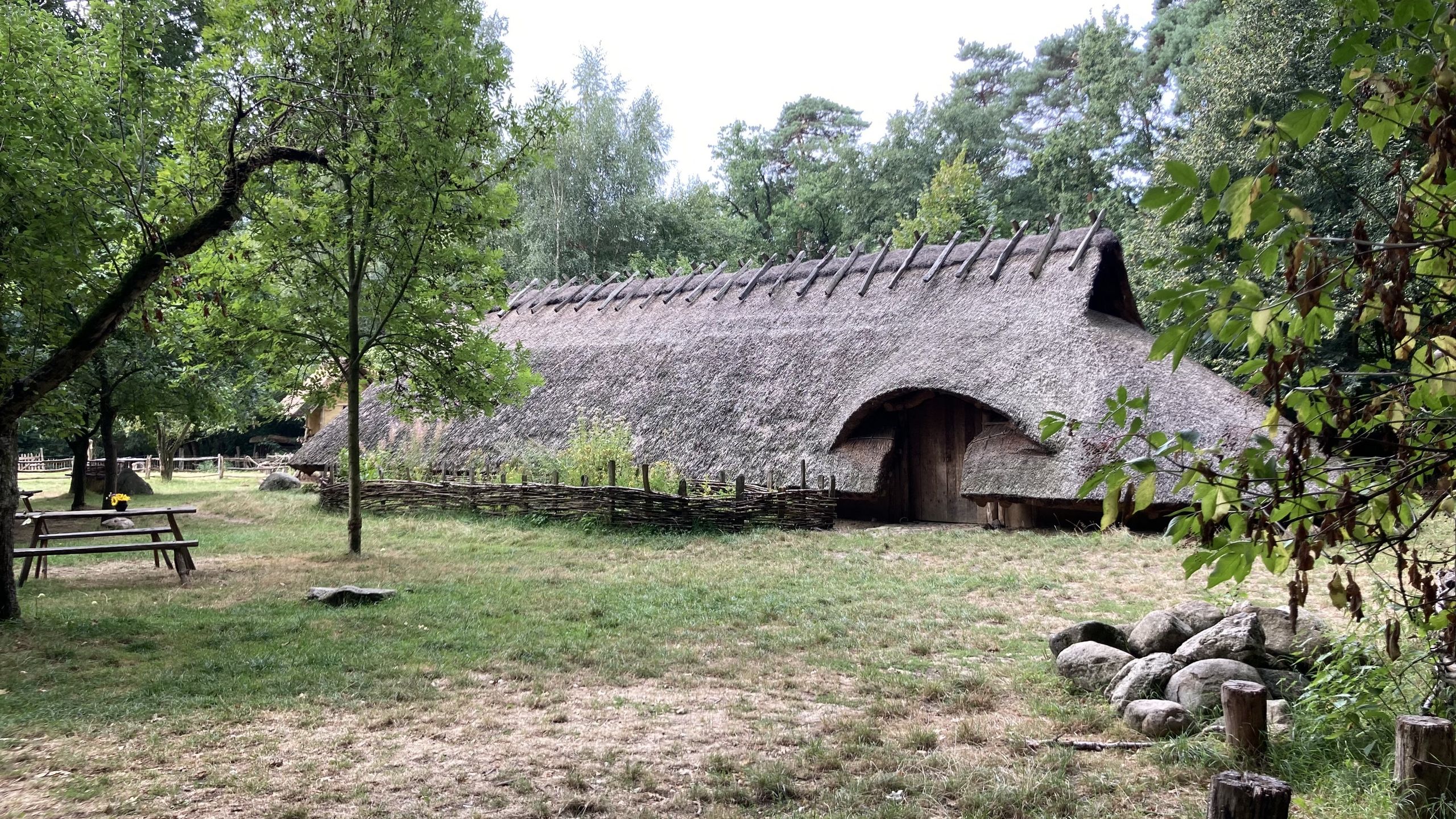 Passend dazu starte ich meine Wanderung am Bronzezeithof in Uelsen. Dieser ist nach archäologischem Wissen gebaut und bietet den Besuchern nicht nur einen authentischen Blick in die Vergangenheit, sondern sie können die Bronzezeit zum Anfassen und Mitmachen erleben und erfahren, wie unsere Vorfahren zu dieser Zeit in der Grafschaft gelebt haben. Direkt nebenan befindet sich der Blekker Hof mit einem gemütlichen Hofcafé und einem kleinen Hofladen. Außerdem können dort Tiere, wie beispielsweise das Bunte Bentheimer Schwein bestaunt werden. Bereits nach einer kurzen Wanderung komme ich zum idyllischen Heideweiher Statt, der ein bisschen versteckt inmitten von Bäumen gelegen ist. Obwohl ich noch nicht lange unterwegs bin, nehme ich auf einer der Liegen Platz und genieße die Natur für einen kurzen Moment.
